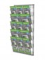 Kaskadowy zestaw pięciu kieszeni formatu A4 poziomo z możliwością podziału na ulotki A5 i Dl. Wykonany z kieszonek plexi i stelaża z anodowanego aluminium. Do powieszenia na ścianie.